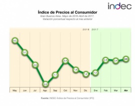 http://www.indec.gob.ar/uploads/informesdeprensa/ipc_05_17.pdf El Índice de Precios al Consumidor registró en abril una suba de 2,6% y en el primer cuatrimestre del año acumuló un incremento de 9,1%, informó el Instituto Nacional de Estadística y Censos (Indec). La suba de abril fue impulsada por las alzas de 2,2% registrada en el rubro Alimentos y Bebidas; 4,6% en Vivienda y Servicios Básicos y 3,2% en Educación. Con los números de abril, la dependencia oficial retomó la difusión de la comparación interanual, luego de un año de que se restableciera la medición de precios, al dar cuenta que en los últimos 12 meses la inflación acumula un avance de 27,5%. La suba del 2,6% registrada por el Indec en abril se ubicó por encima de todos los relevamientos realizados por consultoras privadas, que dieron cuenta de un rango de entre 2,1% y 2,4% de incremento. Más allá de las estimaciones, lo cierto es que la inflación de abril estuvo signada por un aumento del 2,2 % en Alimentos y Bebidas, por las subas del 2,5% en la Carne, 5% en Productos Lácteos y Huevos, 2 % en Bebidas Alcohólicas, que no pusieron ser compensadas por la merma del 2,9% en Frutas. Otro rubro que gravitó con firmeza fue la suba del 4,6% en Vivienda y Servicios Básicos, donde el aumento de la tarifa del gas impulsaron este incremento. Otro rubro que gravitó con firmeza fue Indumentaria, por el cambio de estación, que  presentó un alza del 5,1%, con una suba del 63% en Ropa Exterior, y del 3,5% en Calzado. También la Educación presentó una suba por sobre el promedio, 3,2%, con un alza del 3,9% en las cuotas de las escuelas y colegios privados. El Indec dio cuenta que esta suba del 2,6% estuvo compuesta por un alza del 0,68% de los precios Regulados, del 0,26% de los Estacionales, y del 1,52% de lo que se conoce como “Inflación Núcleo”. En el primer cuatrimestre del año, y con una inflación del 9,1%, los precios regulados explican un alza del 3,17%, los estacionales el 0,88, y la “Núcleo” el 5,02%. En el cuatrimestre, y con una inflación del 9,1%, la suba de Alimentos y Bebidas tuvo una incidencia de 3,15 puntos, Vivienda y Servicios Básicos, donde se juntan las tarifas de los servicios y los alquileres, el 1,66 puntos; Transporte y Telecomunicaciones 1,18 puntos, como las subas más significativas. El Indec tiene previsto informar la semana que viene la variación del Indice de Precios Mayoristas, y el Costo de la Construcción. Antes de que el Indec diera a conocer el IPC de abril, el ministro de Hacienda, Nicolás Dujovne, dijo ayer que el principal objetivo del gobierno es seguir trabajando para bajar la inflación y describió que esa tarea ”es un proceso arduo que al principio tiene costos pero una vez que el esquema funciona genera muchísimos beneficios”. "Argentina está sentando las bases para tener un sistema monetario muy eficiente, para tener en dos años tasas de inflación muy parecidas a las del resto del mundo", sostuvo Dujovne en declaraciones radiales.   Fuente: INDEC