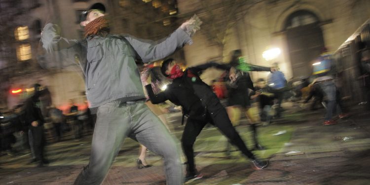 Veintitrés detenidos y 17 heridos, entre ellos nueve policías, se registraron esta noche durante los graves incidentes protagonizados por un grupo minoritario en Plaza de Mayo y sus adyacencias, luego de la masiva marcha por Santiago Maldonado, informaron a DyN fuentes del Gobierno de la Ciudad. Los incidentes comenzaron cerca de las 21 cuando grupos de manifestantes se enfrentaron con efectivos policiales, prendieron fuego a contenedores de basura y realizaron pintadas en distintos edificios céntricos. Personal de la Policía de la Ciudad detuvo a 23 personas en la zona de la Plaza de Mayo e inmediaciones entre los manifestantes rezagados del acto, en medio de incidentes que se extendieron incluso hasta las cercanías del Congreso. Además, en los enfrentamientos resultaron heridas 18 personas, de los cuales 9 son efectivos policiales, precisaron las fuentes a esta agencia. Los incidentes comenzaron en Rivadavia y Reconquista, donde jóvenes encapuchados intentaron derribar las vallas que separaron a los manifestantes de la Casa Rosada, pero luego se extendieron por Avenida de Mayo y Perú, cruzaron 9 de Julio y alcanzaron las inmediaciones del Congreso. Los activistas, alrededor de medio centenar de jóvenes, algunos de los cuáles actuaban encapuchados, encendieron fogatas en los contenedores de basura, realizaron pintadas en distintos edificios y arrojaron piedras, varias horas después de terminado el acto central. Durante la refriega se escuchaban detonaciones de postas de goma mientras varias decenas de efectivos de la policía antimotines avanzaban con sus escudos y otros, mayormente de civil, efectuaban las detenciones. A su paso, los manifestantes pintaron el frente del Cabildo con leyendas en contra del gobierno de Mauricio Macri, teniendo a la ministra de Seguridad, Patricia Bullrich, como blanco principal. Los manifestantes también vandalizaron la puerta de la sucursal del INDEC, ubicada frente a la Legislatura Porteña, en el cruce de Julio A. Roca y Perú, donde prendieron fuego un contenedor de basura que fue extinto por los bomberos. Sobre la 9 de Julio se vivió una situación particular, ya que mientras se producían corridas y se escuchaban disparos de balas de goma, el tránsito circulaba con total normalidad. Entre las personas lesionadas se encontraban efectivos policiales, uno de los cuáles recibió una herida cortante en la frente, ciudadanos que participaban de la marcha y hasta un reportero gráfico, que recibió un botellazo en una de sus orejas, mientras que algunos periodistas, especialmente de Canal 13 y TN eran increpados por algunos manifestantes. Las fuerzas de seguridad de la Ciudad desplegaron carros de asalto y camiones hidrantes; patrulleros y agentes motorizados para repeler los incidentes y efectuar las detenciones, en tanto que varias dotaciones de bomberos trabajaron en distintos puntos para apagar los focos de incendio. Personal del SAME, asimismo, atendió a las personas heridas en los distintos incidentes a lo largo de la Avenida de Mayo. Pasadas las 23, la situación comenzaba a normalizarse y las cuadrillas de la Ciudad realizaban la lenta tarea de limpieza para despejar las calles afectadas Fuente: DyN